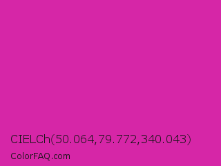 CIELCh 50.064,79.772,340.043 Color is a normal magenta color and the nearest color is Frostbite #e936a7. Hex code #d626a7 and RGB value is rgb(214,38,167). In RGB color space, this color is composed of 84% red, 15% green, 65% blue, In CMYK color space, this color is composed of 0% cyan, 82% magenta, 22% yellow , 16% black , In HSL color space, this color has a hue angle of 316° , 70% saturation and 49% lightness.