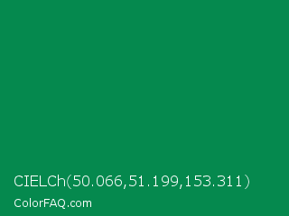 CIELCh 50.066,51.199,153.311 Color is a dark green color and the nearest color is Spanish Green #009150. Hex code #05894e and RGB value is rgb(5,137,78). In RGB color space, this color is composed of 2% red, 54% green, 31% blue, In CMYK color space, this color is composed of 96% cyan, 0% magenta, 43% yellow , 46% black , In HSL color space, this color has a hue angle of 153° , 93% saturation and 28% lightness.
