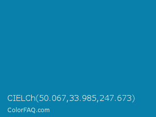 CIELCh 50.067,33.985,247.673 Color is a normal blue color and the nearest color is Deep Cerulean #007ba7. Hex code #0980ac and RGB value is rgb(9,128,172). In RGB color space, this color is composed of 4% red, 50% green, 67% blue, In CMYK color space, this color is composed of 95% cyan, 26% magenta, 0% yellow , 33% black , In HSL color space, this color has a hue angle of 196° , 90% saturation and 35% lightness.