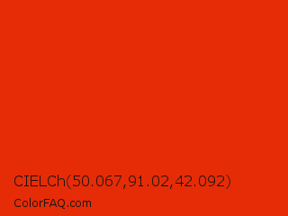 CIELCh 50.067,91.02,42.092 Color is a normal red color and the nearest color is Ferrari Red #ff2800. Hex code #e52c07 and RGB value is rgb(229,44,7). In RGB color space, this color is composed of 90% red, 17% green, 3% blue, In CMYK color space, this color is composed of 0% cyan, 81% magenta, 97% yellow , 10% black , In HSL color space, this color has a hue angle of 10° , 94% saturation and 46% lightness.