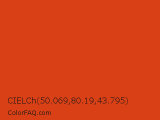 CIELCh 50.069,80.19,43.795 Color is a normal red color and the nearest color is Vermilion #d9381e. Hex code #d94016 and RGB value is rgb(217,64,22). In RGB color space, this color is composed of 85% red, 25% green, 9% blue, In CMYK color space, this color is composed of 0% cyan, 71% magenta, 90% yellow , 15% black , In HSL color space, this color has a hue angle of 13° , 82% saturation and 47% lightness.