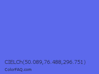 CIELCh 50.089,76.488,296.751 Color is a light blue color and the nearest color is Very Light Blue #6666ff. Hex code #5c69ed and RGB value is rgb(92,105,237). In RGB color space, this color is composed of 36% red, 41% green, 93% blue, In CMYK color space, this color is composed of 61% cyan, 56% magenta, 0% yellow , 7% black , In HSL color space, this color has a hue angle of 235° , 80% saturation and 65% lightness.