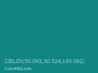 CIELCh 50.093,30.524,193.062 Color is a dark cyan color and the nearest color is Metallic Seaweed #0a7e8c. Hex code #108582 and RGB value is rgb(16,133,130). In RGB color space, this color is composed of 6% red, 52% green, 51% blue, In CMYK color space, this color is composed of 88% cyan, 0% magenta, 2% yellow , 48% black , In HSL color space, this color has a hue angle of 178° , 79% saturation and 29% lightness.