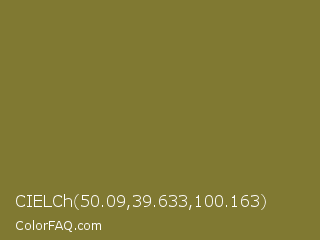 CIELCh 50.09,39.633,100.163 Color is a normal yellow color and the nearest color is Spanish Bistre #807532. Hex code #807932 and RGB value is rgb(128,121,50). In RGB color space, this color is composed of 50% red, 47% green, 20% blue, In CMYK color space, this color is composed of 0% cyan, 5% magenta, 61% yellow , 50% black , In HSL color space, this color has a hue angle of 55° , 44% saturation and 35% lightness.