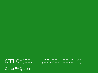 CIELCh 50.111,67.28,138.614 Color is a normal green color and the nearest color is Forest Green #228b22. Hex code #1a8a22 and RGB value is rgb(26,138,34). In RGB color space, this color is composed of 10% red, 54% green, 13% blue, In CMYK color space, this color is composed of 81% cyan, 0% magenta, 75% yellow , 46% black , In HSL color space, this color has a hue angle of 124° , 68% saturation and 32% lightness.