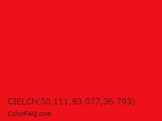 CIELCh 50.111,93.077,36.793 Color is a normal red color and the nearest color is Vivid Red #f70d1a. Hex code #ed121a and RGB value is rgb(237,18,26). In RGB color space, this color is composed of 93% red, 7% green, 10% blue, In CMYK color space, this color is composed of 0% cyan, 92% magenta, 89% yellow , 7% black , In HSL color space, this color has a hue angle of 358° , 86% saturation and 50% lightness.