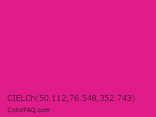 CIELCh 50.112,76.548,352.743 Color is a normal magenta color and the nearest color is Barbie Pink #e0218a. Hex code #e01c8a and RGB value is rgb(224,28,138). In RGB color space, this color is composed of 88% red, 11% green, 54% blue, In CMYK color space, this color is composed of 0% cyan, 88% magenta, 38% yellow , 12% black , In HSL color space, this color has a hue angle of 326° , 78% saturation and 49% lightness.