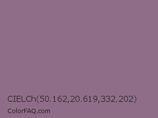 CIELCh 50.162,20.619,332.202 Color is a normal magenta color and the nearest color is Strikemaster #956387. Hex code #8f6d88 and RGB value is rgb(143,109,136). In RGB color space, this color is composed of 56% red, 43% green, 53% blue, In CMYK color space, this color is composed of 0% cyan, 24% magenta, 5% yellow , 44% black , In HSL color space, this color has a hue angle of 312° , 13% saturation and 49% lightness.