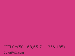 CIELCh 50.168,65.711,356.185 Color is a normal rose color and the nearest color is Cerise #da3287. Hex code #d53881 and RGB value is rgb(213,56,129). In RGB color space, this color is composed of 84% red, 22% green, 51% blue, In CMYK color space, this color is composed of 0% cyan, 74% magenta, 39% yellow , 16% black , In HSL color space, this color has a hue angle of 332° , 65% saturation and 53% lightness.