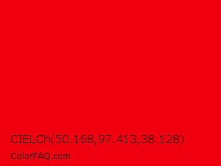 CIELCh 50.168,97.413,38.128 Color is a normal red color and the nearest color is KU Crimson #e8000d. Hex code #f0000f and RGB value is rgb(240,0,15). In RGB color space, this color is composed of 94% red, 0% green, 6% blue, In CMYK color space, this color is composed of 0% cyan, 100% magenta, 94% yellow , 6% black , In HSL color space, this color has a hue angle of 356° , 100% saturation and 47% lightness.