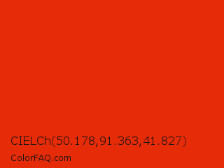 CIELCh 50.178,91.363,41.827 Color is a normal red color and the nearest color is Red RYB #fe2712. Hex code #e62b08 and RGB value is rgb(230,43,8). In RGB color space, this color is composed of 90% red, 17% green, 3% blue, In CMYK color space, this color is composed of 0% cyan, 81% magenta, 97% yellow , 10% black , In HSL color space, this color has a hue angle of 9° , 93% saturation and 47% lightness.