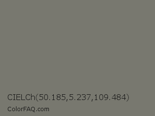 CIELCh 50.185,5.237,109.484 Color is a normal yellow color and the nearest color is Tapa #7b7874. Hex code #78786f and RGB value is rgb(120,120,111). In RGB color space, this color is composed of 47% red, 47% green, 44% blue, In CMYK color space, this color is composed of 0% cyan, 0% magenta, 8% yellow , 53% black , In HSL color space, this color has a hue angle of 60° , 4% saturation and 45% lightness.