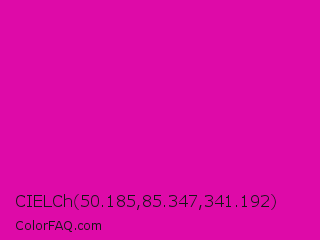 CIELCh 50.185,85.347,341.192 Color is a normal magenta color and the nearest color is Hollywood Cerise #f400a1. Hex code #de0aa8 and RGB value is rgb(222,10,168). In RGB color space, this color is composed of 87% red, 4% green, 66% blue, In CMYK color space, this color is composed of 0% cyan, 95% magenta, 24% yellow , 13% black , In HSL color space, this color has a hue angle of 315° , 91% saturation and 45% lightness.