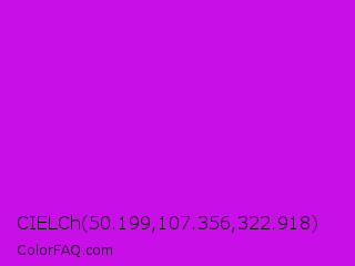 CIELCh 50.199,107.356,322.918 Color is a normal purple color and the nearest color is Vivid Mulberry #b80ce3. Hex code #c90fe8 and RGB value is rgb(201,15,232). In RGB color space, this color is composed of 79% red, 6% green, 91% blue, In CMYK color space, this color is composed of 13% cyan, 94% magenta, 0% yellow , 9% black , In HSL color space, this color has a hue angle of 291° , 88% saturation and 48% lightness.