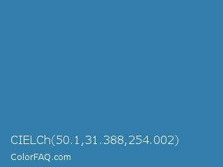 CIELCh 50.1,31.388,254.002 Color is a normal blue color and the nearest color is Astral #327da0. Hex code #327eaa and RGB value is rgb(50,126,170). In RGB color space, this color is composed of 20% red, 49% green, 67% blue, In CMYK color space, this color is composed of 71% cyan, 26% magenta, 0% yellow , 33% black , In HSL color space, this color has a hue angle of 202° , 55% saturation and 43% lightness.
