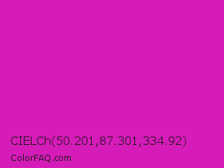 CIELCh 50.201,87.301,334.92 Color is a normal magenta color and the nearest color is Steel Pink #cc33cc. Hex code #d61cb8 and RGB value is rgb(214,28,184). In RGB color space, this color is composed of 84% red, 11% green, 72% blue, In CMYK color space, this color is composed of 0% cyan, 87% magenta, 14% yellow , 16% black , In HSL color space, this color has a hue angle of 310° , 77% saturation and 47% lightness.