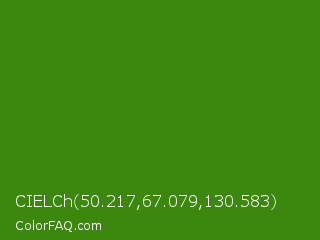 CIELCh 50.217,67.079,130.583 Color is a dark green color and the nearest color is La Palma #368716. Hex code #3c880e and RGB value is rgb(60,136,14). In RGB color space, this color is composed of 24% red, 53% green, 5% blue, In CMYK color space, this color is composed of 56% cyan, 0% magenta, 90% yellow , 47% black , In HSL color space, this color has a hue angle of 97° , 81% saturation and 29% lightness.