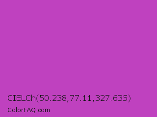 CIELCh 50.238,77.11,327.635 Color is a normal magenta color and the nearest color is Fuchsia Pink #c154c1. Hex code #bf41bf and RGB value is rgb(191,65,191). In RGB color space, this color is composed of 75% red, 25% green, 75% blue, In CMYK color space, this color is composed of 0% cyan, 66% magenta, 0% yellow , 25% black , In HSL color space, this color has a hue angle of 300° , 50% saturation and 50% lightness.