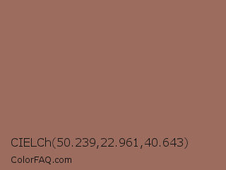 CIELCh 50.239,22.961,40.643 Color is a normal red color and the nearest color is Toast #9a6e61. Hex code #9c6c5f and RGB value is rgb(156,108,95). In RGB color space, this color is composed of 61% red, 42% green, 37% blue, In CMYK color space, this color is composed of 0% cyan, 31% magenta, 39% yellow , 39% black , In HSL color space, this color has a hue angle of 13° , 24% saturation and 49% lightness.