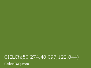 CIELCh 50.274,48.097,122.844 Color is a normal green color and the nearest color is Maximum Green #5e8c31. Hex code #60822e and RGB value is rgb(96,130,46). In RGB color space, this color is composed of 38% red, 51% green, 18% blue, In CMYK color space, this color is composed of 26% cyan, 0% magenta, 65% yellow , 49% black , In HSL color space, this color has a hue angle of 84° , 48% saturation and 35% lightness.