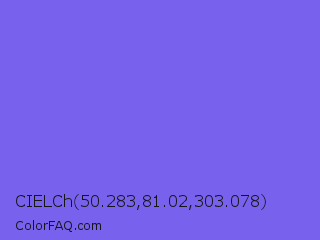 CIELCh 50.283,81.02,303.078 Color is a light indigo color and the nearest color is Medium Slate Blue #7b68ee. Hex code #7861ed and RGB value is rgb(120,97,237). In RGB color space, this color is composed of 47% red, 38% green, 93% blue, In CMYK color space, this color is composed of 49% cyan, 59% magenta, 0% yellow , 7% black , In HSL color space, this color has a hue angle of 250° , 80% saturation and 65% lightness.