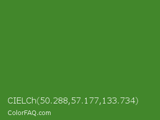 CIELCh 50.288,57.177,133.734 Color is a normal green color and the nearest color is Sap Green #507d2a. Hex code #42872b and RGB value is rgb(66,135,43). In RGB color space, this color is composed of 26% red, 53% green, 17% blue, In CMYK color space, this color is composed of 51% cyan, 0% magenta, 68% yellow , 47% black , In HSL color space, this color has a hue angle of 105° , 52% saturation and 35% lightness.