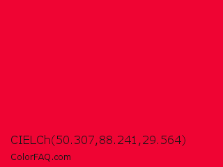 CIELCh 50.307,88.241,29.564 Color is a normal red color and the nearest color is Red Munsell #f2003c. Hex code #ef0433 and RGB value is rgb(239,4,51). In RGB color space, this color is composed of 94% red, 2% green, 20% blue, In CMYK color space, this color is composed of 0% cyan, 98% magenta, 79% yellow , 6% black , In HSL color space, this color has a hue angle of 348° , 97% saturation and 48% lightness.