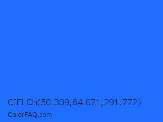 CIELCh 50.309,84.071,291.772 Color is a normal blue color and the nearest color is Blue Crayola #1f75fe. Hex code #206eff and RGB value is rgb(32,110,255). In RGB color space, this color is composed of 13% red, 43% green, 100% blue, In CMYK color space, this color is composed of 87% cyan, 57% magenta, 0% yellow , 0% black , In HSL color space, this color has a hue angle of 219° , 100% saturation and 56% lightness.