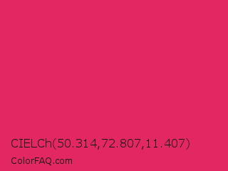 CIELCh 50.314,72.807,11.407 Color is a normal rose color and the nearest color is Razzmatazz #e3256b. Hex code #e32763 and RGB value is rgb(227,39,99). In RGB color space, this color is composed of 89% red, 15% green, 39% blue, In CMYK color space, this color is composed of 0% cyan, 83% magenta, 56% yellow , 11% black , In HSL color space, this color has a hue angle of 341° , 77% saturation and 52% lightness.