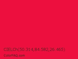 CIELCh 50.314,84.582,26.465 Color is a normal red color and the nearest color is Red Ribbon #ed0a3f. Hex code #ed0f3d and RGB value is rgb(237,15,61). In RGB color space, this color is composed of 93% red, 6% green, 24% blue, In CMYK color space, this color is composed of 0% cyan, 94% magenta, 74% yellow , 7% black , In HSL color space, this color has a hue angle of 348° , 88% saturation and 49% lightness.