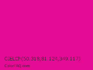 CIELCh 50.318,81.124,349.117 Color is a normal magenta color and the nearest color is Hollywood Cerise #f400a1. Hex code #e30a94 and RGB value is rgb(227,10,148). In RGB color space, this color is composed of 89% red, 4% green, 58% blue, In CMYK color space, this color is composed of 0% cyan, 96% magenta, 35% yellow , 11% black , In HSL color space, this color has a hue angle of 322° , 92% saturation and 46% lightness.