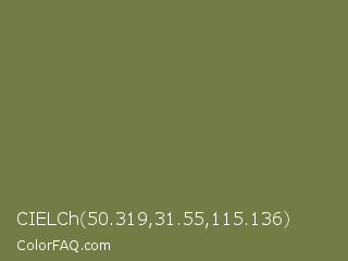 CIELCh 50.319,31.55,115.136 Color is a normal lime color and the nearest color is Go Ben #726d4e. Hex code #727d46 and RGB value is rgb(114,125,70). In RGB color space, this color is composed of 45% red, 49% green, 27% blue, In CMYK color space, this color is composed of 9% cyan, 0% magenta, 44% yellow , 51% black , In HSL color space, this color has a hue angle of 72° , 28% saturation and 38% lightness.