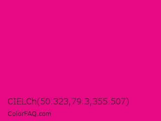 CIELCh 50.323,79.3,355.507 Color is a normal magenta color and the nearest color is Mexican Pink #e4007c. Hex code #e60885 and RGB value is rgb(230,8,133). In RGB color space, this color is composed of 90% red, 3% green, 52% blue, In CMYK color space, this color is composed of 0% cyan, 97% magenta, 42% yellow , 10% black , In HSL color space, this color has a hue angle of 326° , 93% saturation and 47% lightness.