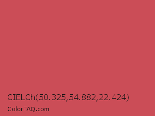 CIELCh 50.325,54.882,22.424 Color is a normal red color and the nearest color is Dark Terra Cotta #cc4e5c. Hex code #cb4d57 and RGB value is rgb(203,77,87). In RGB color space, this color is composed of 80% red, 30% green, 34% blue, In CMYK color space, this color is composed of 0% cyan, 62% magenta, 57% yellow , 20% black , In HSL color space, this color has a hue angle of 355° , 55% saturation and 55% lightness.