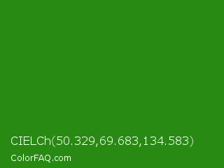 CIELCh 50.329,69.683,134.583 Color is a normal green color and the nearest color is Slimy Green #299617. Hex code #298a13 and RGB value is rgb(41,138,19). In RGB color space, this color is composed of 16% red, 54% green, 7% blue, In CMYK color space, this color is composed of 70% cyan, 0% magenta, 86% yellow , 46% black , In HSL color space, this color has a hue angle of 109° , 76% saturation and 31% lightness.