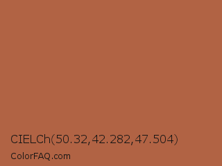 CIELCh 50.32,42.282,47.504 Color is a normal orange color and the nearest color is Brown Rust #af593e. Hex code #b16344 and RGB value is rgb(177,99,68). In RGB color space, this color is composed of 69% red, 39% green, 27% blue, In CMYK color space, this color is composed of 0% cyan, 44% magenta, 62% yellow , 31% black , In HSL color space, this color has a hue angle of 17° , 44% saturation and 48% lightness.