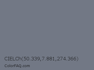 CIELCh 50.339,7.881,274.366 Color is a normal blue color and the nearest color is Storm Gray #717486. Hex code #727885 and RGB value is rgb(114,120,133). In RGB color space, this color is composed of 45% red, 47% green, 52% blue, In CMYK color space, this color is composed of 14% cyan, 10% magenta, 0% yellow , 48% black , In HSL color space, this color has a hue angle of 221° , 8% saturation and 48% lightness.