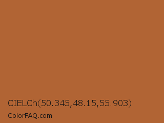 CIELCh 50.345,48.15,55.903 Color is a normal orange color and the nearest color is Tuscany #bd5e2e. Hex code #b16434 and RGB value is rgb(177,100,52). In RGB color space, this color is composed of 69% red, 39% green, 20% blue, In CMYK color space, this color is composed of 0% cyan, 44% magenta, 71% yellow , 31% black , In HSL color space, this color has a hue angle of 23° , 55% saturation and 45% lightness.