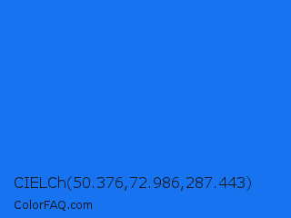 CIELCh 50.376,72.986,287.443 Color is a normal blue color and the nearest color is Blue Crayola #1f75fe. Hex code #1773f0 and RGB value is rgb(23,115,240). In RGB color space, this color is composed of 9% red, 45% green, 94% blue, In CMYK color space, this color is composed of 90% cyan, 52% magenta, 0% yellow , 6% black , In HSL color space, this color has a hue angle of 215° , 88% saturation and 52% lightness.