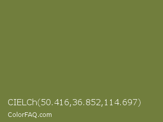 CIELCh 50.416,36.852,114.697 Color is a normal lime color and the nearest color is Pesto #7c7631. Hex code #717e3d and RGB value is rgb(113,126,61). In RGB color space, this color is composed of 44% red, 49% green, 24% blue, In CMYK color space, this color is composed of 10% cyan, 0% magenta, 52% yellow , 51% black , In HSL color space, this color has a hue angle of 72° , 35% saturation and 37% lightness.