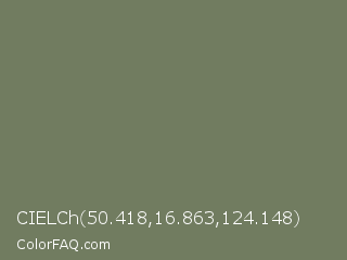 CIELCh 50.418,16.863,124.148 Color is a normal green color and the nearest color is Limed Ash #747d63. Hex code #717c60 and RGB value is rgb(113,124,96). In RGB color space, this color is composed of 44% red, 49% green, 38% blue, In CMYK color space, this color is composed of 9% cyan, 0% magenta, 23% yellow , 51% black , In HSL color space, this color has a hue angle of 84° , 13% saturation and 43% lightness.
