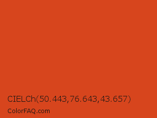 CIELCh 50.443,76.643,43.657 Color is a normal red color and the nearest color is Vermilion #d9381e. Hex code #d7451d and RGB value is rgb(215,69,29). In RGB color space, this color is composed of 84% red, 27% green, 11% blue, In CMYK color space, this color is composed of 0% cyan, 68% magenta, 87% yellow , 16% black , In HSL color space, this color has a hue angle of 13° , 76% saturation and 48% lightness.