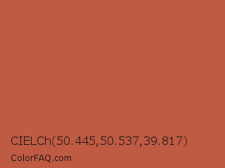 CIELCh 50.445,50.537,39.817 Color is a normal red color and the nearest color is Crail #b95140. Hex code #bf5a43 and RGB value is rgb(191,90,67). In RGB color space, this color is composed of 75% red, 35% green, 26% blue, In CMYK color space, this color is composed of 0% cyan, 53% magenta, 65% yellow , 25% black , In HSL color space, this color has a hue angle of 11° , 49% saturation and 51% lightness.