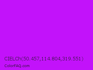 CIELCh 50.457,114.804,319.551 Color is a normal purple color and the nearest color is Electric Purple #bf00ff. Hex code #c212fa and RGB value is rgb(194,18,250). In RGB color space, this color is composed of 76% red, 7% green, 98% blue, In CMYK color space, this color is composed of 22% cyan, 93% magenta, 0% yellow , 2% black , In HSL color space, this color has a hue angle of 286° , 96% saturation and 53% lightness.