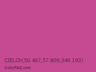 CIELCh 50.467,57.809,346.193 Color is a normal magenta color and the nearest color is Mulberry #c54b8c. Hex code #c54a91 and RGB value is rgb(197,74,145). In RGB color space, this color is composed of 77% red, 29% green, 57% blue, In CMYK color space, this color is composed of 0% cyan, 62% magenta, 26% yellow , 23% black , In HSL color space, this color has a hue angle of 325° , 51% saturation and 53% lightness.