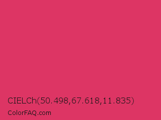 CIELCh 50.498,67.618,11.835 Color is a normal rose color and the nearest color is Cerise Red #de3163. Hex code #dd3564 and RGB value is rgb(221,53,100). In RGB color space, this color is composed of 87% red, 21% green, 39% blue, In CMYK color space, this color is composed of 0% cyan, 76% magenta, 55% yellow , 13% black , In HSL color space, this color has a hue angle of 343° , 71% saturation and 54% lightness.