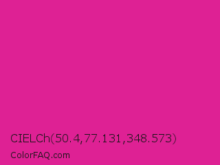 CIELCh 50.4,77.131,348.573 Color is a normal magenta color and the nearest color is Barbie Pink #e0218a. Hex code #de2194 and RGB value is rgb(222,33,148). In RGB color space, this color is composed of 87% red, 13% green, 58% blue, In CMYK color space, this color is composed of 0% cyan, 85% magenta, 33% yellow , 13% black , In HSL color space, this color has a hue angle of 323° , 74% saturation and 50% lightness.