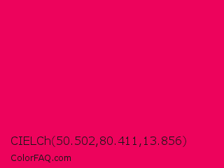 CIELCh 50.502,80.411,13.856 Color is a normal rose color and the nearest color is Razzmatazz Crayola #e30b5c. Hex code #ed035c and RGB value is rgb(237,3,92). In RGB color space, this color is composed of 93% red, 1% green, 36% blue, In CMYK color space, this color is composed of 0% cyan, 99% magenta, 61% yellow , 7% black , In HSL color space, this color has a hue angle of 337° , 98% saturation and 47% lightness.
