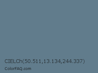 CIELCh 50.511,13.134,244.337 Color is a normal blue color and the nearest color is Steel Teal #5f8a8b. Hex code #617c8c and RGB value is rgb(97,124,140). In RGB color space, this color is composed of 38% red, 49% green, 55% blue, In CMYK color space, this color is composed of 31% cyan, 11% magenta, 0% yellow , 45% black , In HSL color space, this color has a hue angle of 202° , 18% saturation and 46% lightness.