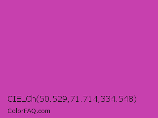 CIELCh 50.529,71.714,334.548 Color is a normal magenta color and the nearest color is Byzantine #bd33a4. Hex code #c740ae and RGB value is rgb(199,64,174). In RGB color space, this color is composed of 78% red, 25% green, 68% blue, In CMYK color space, this color is composed of 0% cyan, 68% magenta, 13% yellow , 22% black , In HSL color space, this color has a hue angle of 311° , 55% saturation and 52% lightness.